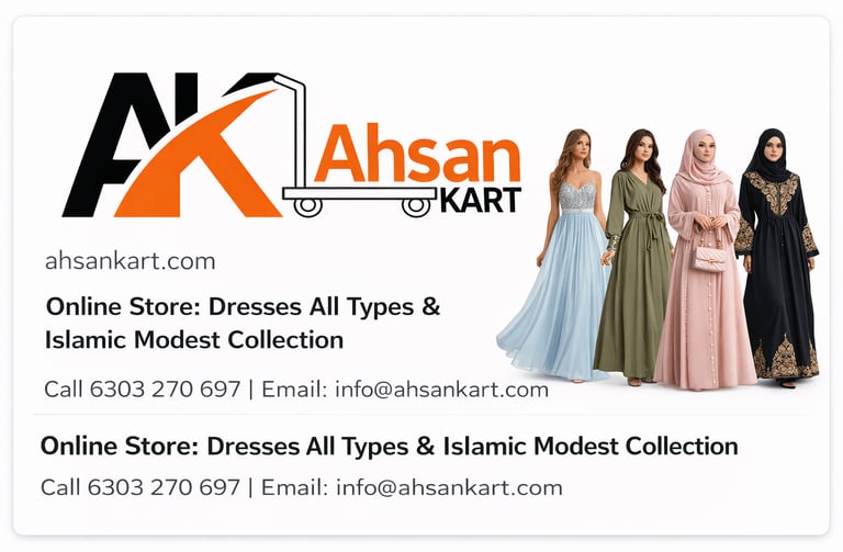 Ahsan Kart is your trusted online store for all types of dresses, from everyday fashion to elegant Islamic modest wear. We offer a carefully selected collection of Abayas, Hijabs, and modern outfits that combine style, comfort, and quality. Our mission is to make fashionable and modest clothing easily accessible for everyone, with reliable service and customer satisfaction at the heart of everything we do.